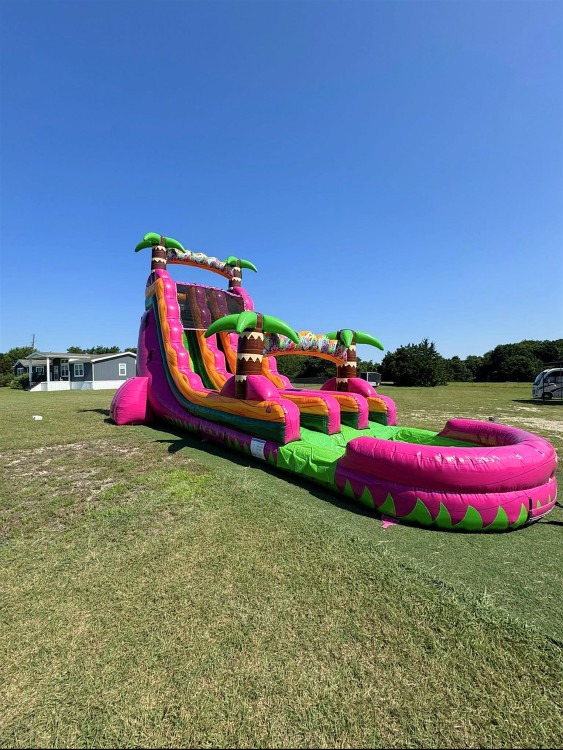 Bring the energy with our 22’ Dual Lane Magenta Breeze Water Slide! This tropical showstopper features bold magenta, electric green, and bright orange colors with twin lanes for double the fun. The wide inflated pool and playful palm tree accents make it a crowd favorite for any summer event. Perfect for kids, teens, and adults ready to cool off in style.